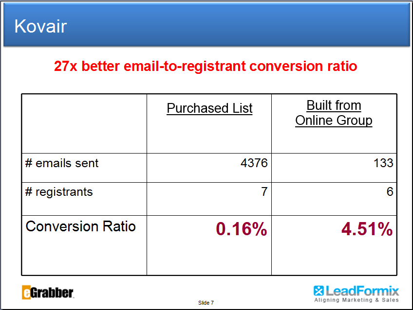 Traditionally, these companies were purchasing contact lists or downloading contacts from Jigsaw and sending out webinar invitations to those contacts. Then, they were introduced to the eGrabber method of Identifying Profiles and Groups, and using LeadGrabber Pro to make a list of the group members, with their email addresses. When they sent out email invitations, here were the results they got…